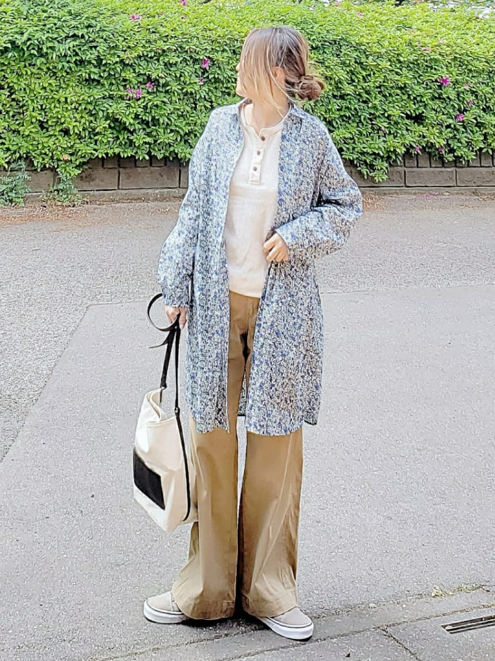 ブルー × ベージュ💙💛 この色合わせ好きです 小花柄がかわいい羽織りは季節的にちょうど 良くて最近よく着回してます♪ 【To b.by agnes b.】の 〈WEB限定 WT62 DRESS ブルーミング フラワードレスミニ〉です 甘めに感じる花柄が意外とクールさもあって 今回はUNIQLOのバギーパンツとカジュアルに😊 Instagram⏩⏩@and_rich_