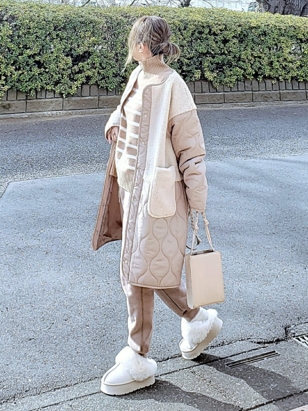 &りっちのその他アウター「ノーカラーボア×ひょうたんキルトコート」を使ったコーディネート