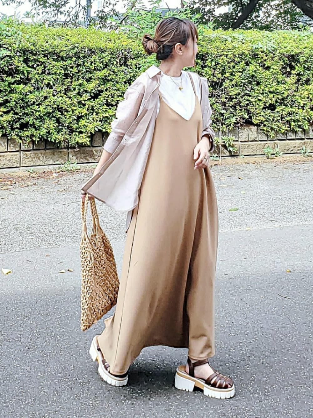 キャミワンピはポンチ素材で 落ち感あるシルエット✨ シアーシャツ&タンクはセットアイテムで 室内外でシャツを脱ぎ着して調節⭐️ Instagram⏩⏩@and_rich_