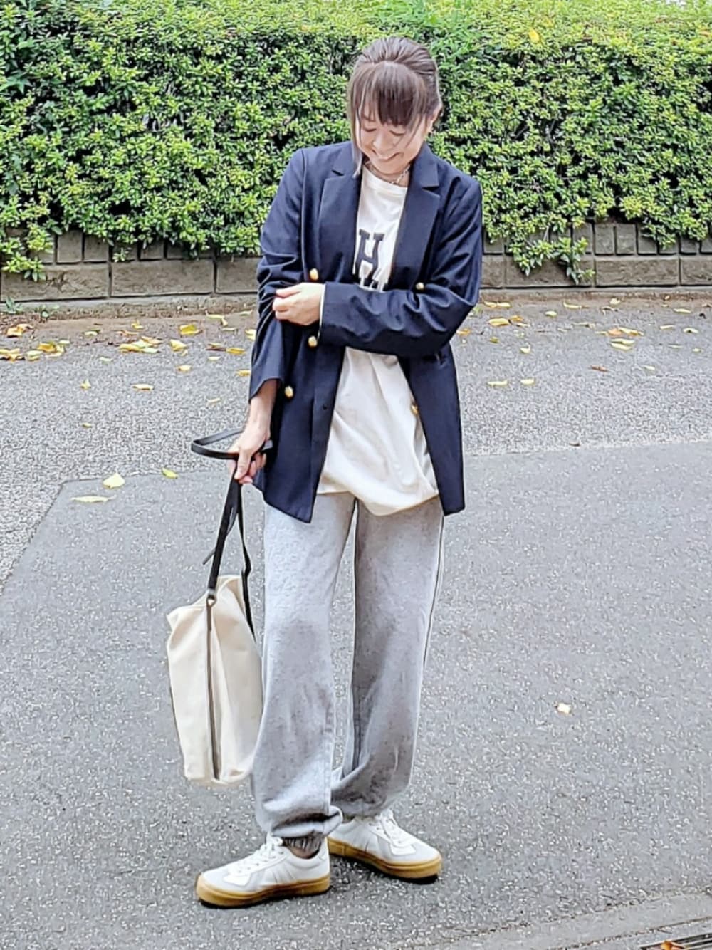 大好きなジャケットスタイル🖤 カチッとした紺ブレに スウェットパンツでカジュアルダウン😊 やっぱり紺ブレはダブルのボックス型で 金ボタンがタイプ🤭 Instagram⏩⏩@and_rich_