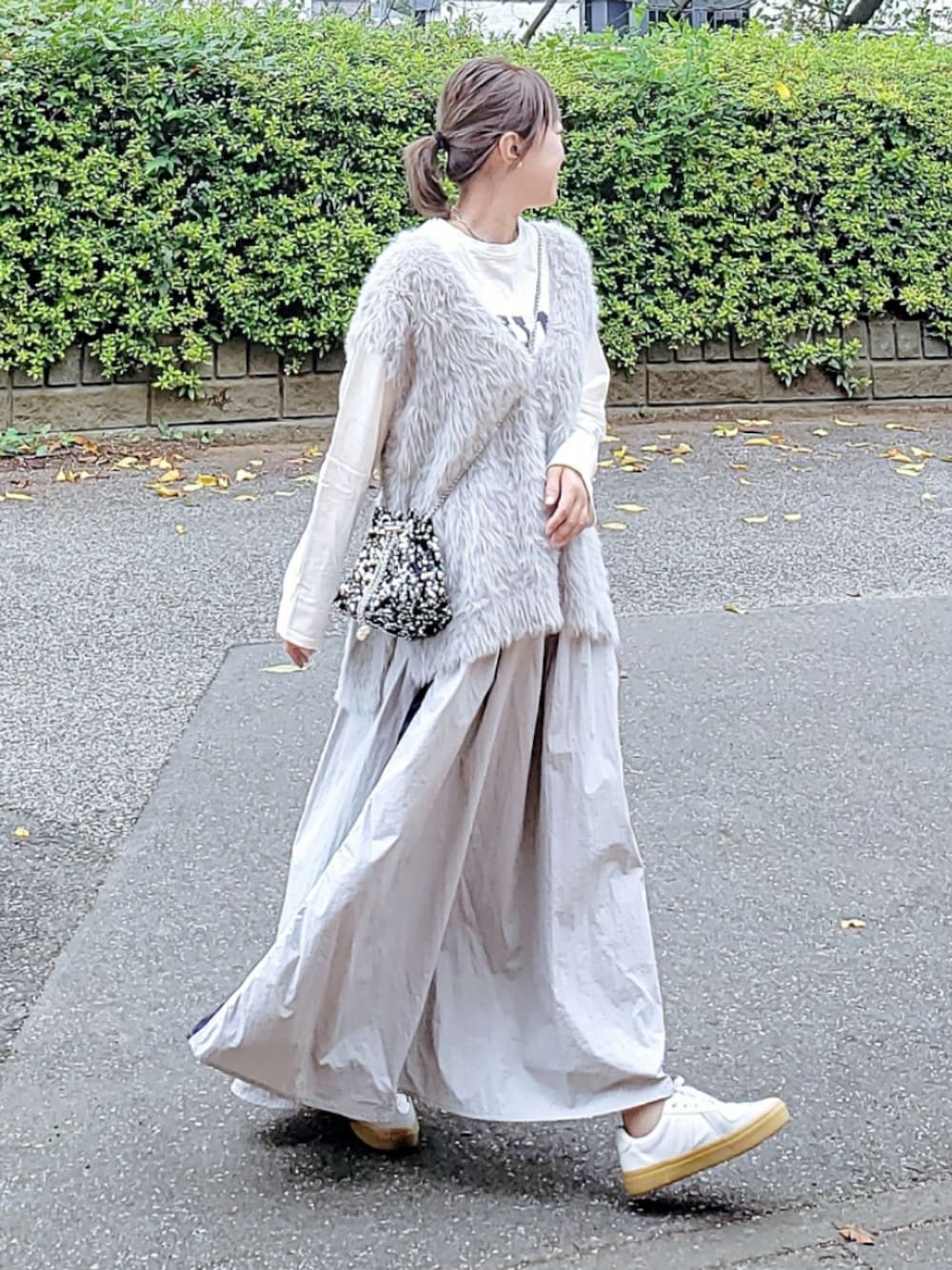 シャギーベストにナイロンスカートを♪ ライトグレーでワントーン♡ Instagram⏩⏩@and_rich_