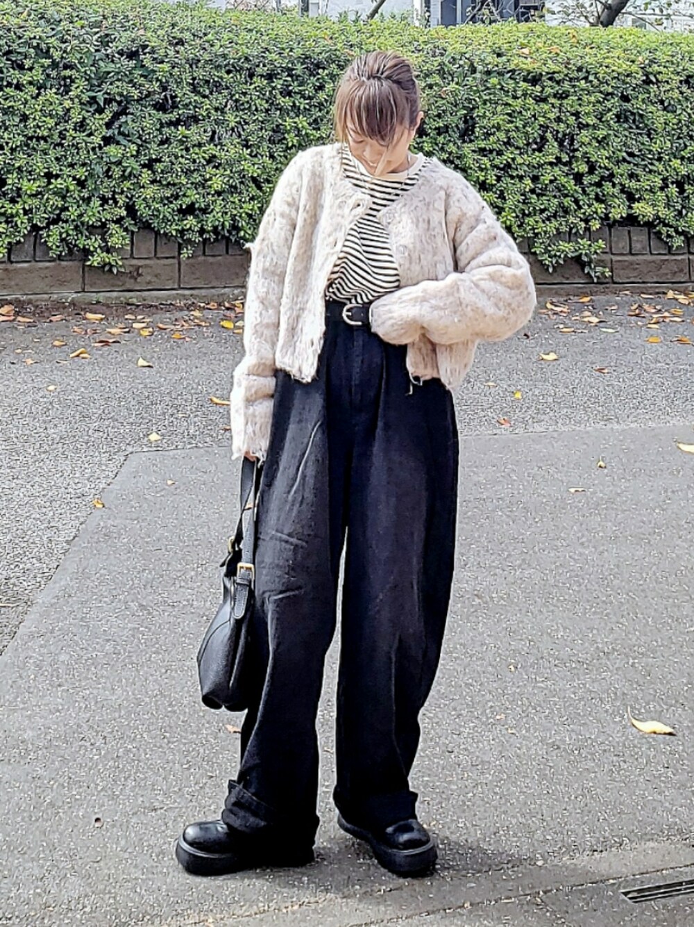 シャギーニットカーディガンに ワイドデニムでカジュアルに♪ カーディガンがショート丈なので だぼだぼデニムが映える✨ 楽ちんだけどカッコいい雰囲気も 出てくれる組み合わせ🖤 Instagram⏩⏩@and_rich_