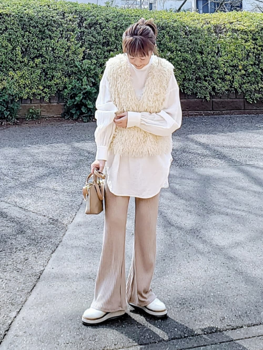 白シャツ×フリンジベスト アイボリーとかベージュでまとめるのって 季節関係なく優しい印象になれる✨ 新生活の時期にちょうど良いかも🙆 Instagram⏩⏩@and_rich_