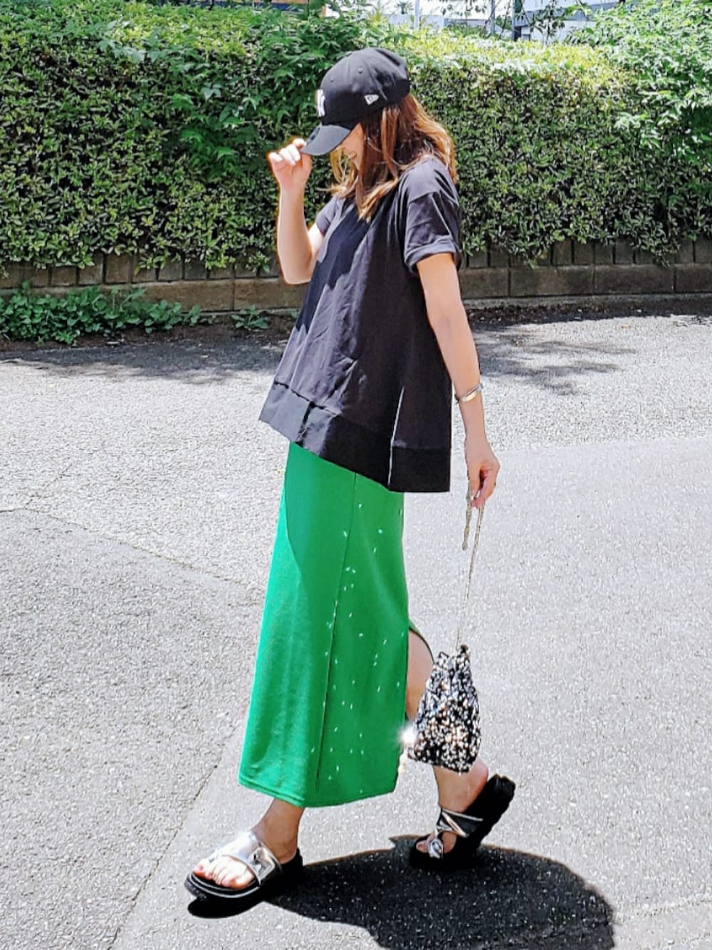 ブラック×グリーン🖤💚 パキッとした色合わせに キャップが映える~✴️ 女子感とカッコ良さ、両方あるコーデが 夏に着たい気分♪ 【NEW ERA】 ▪️ニューエラベースボールキャップ MLB 9FORTY (ブラック×ホワイト) Instagram⏩⏩@and_rich_