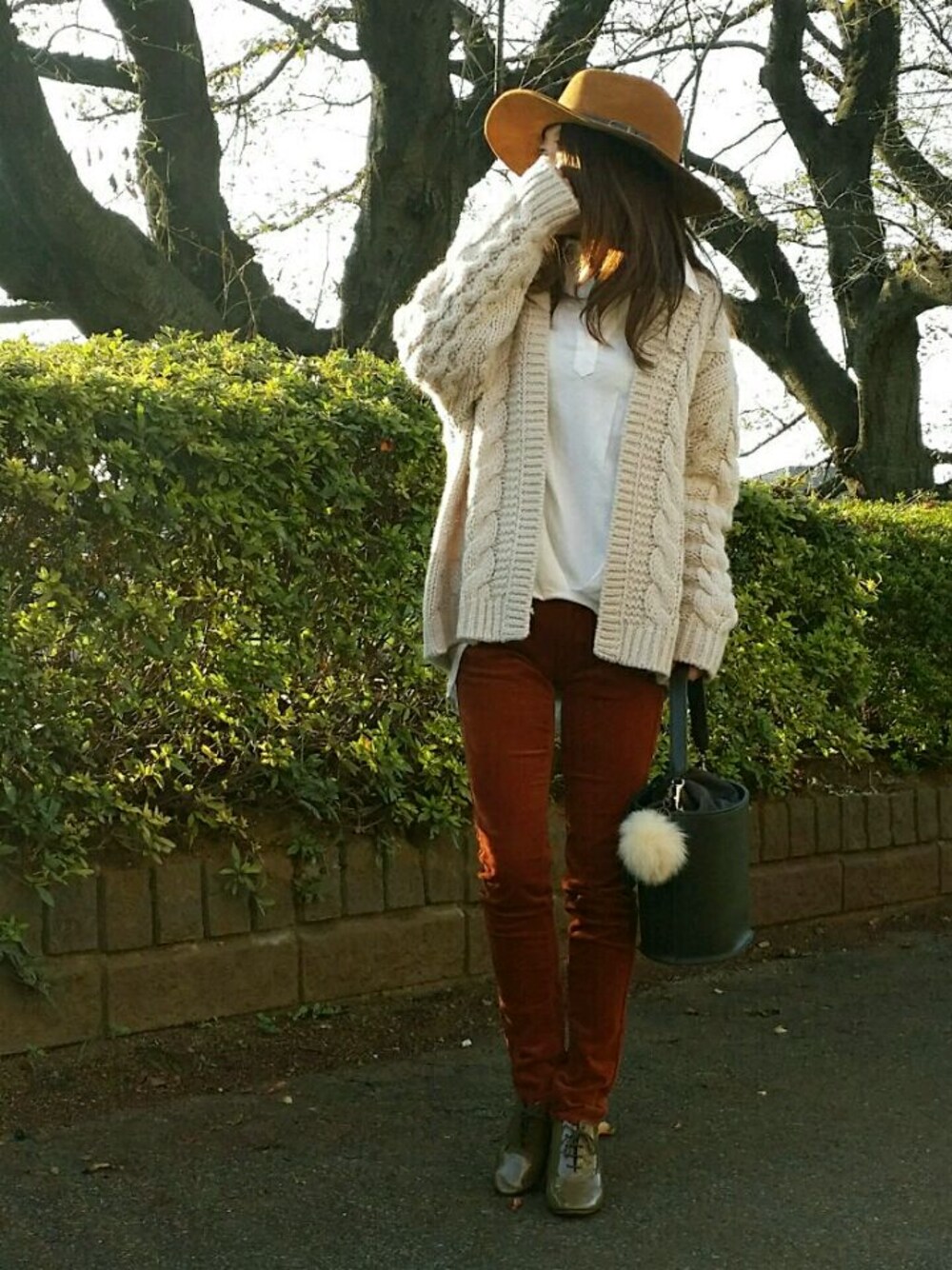 こげ茶のコーデュロイパンツにざっくりニットカーディガン♪
