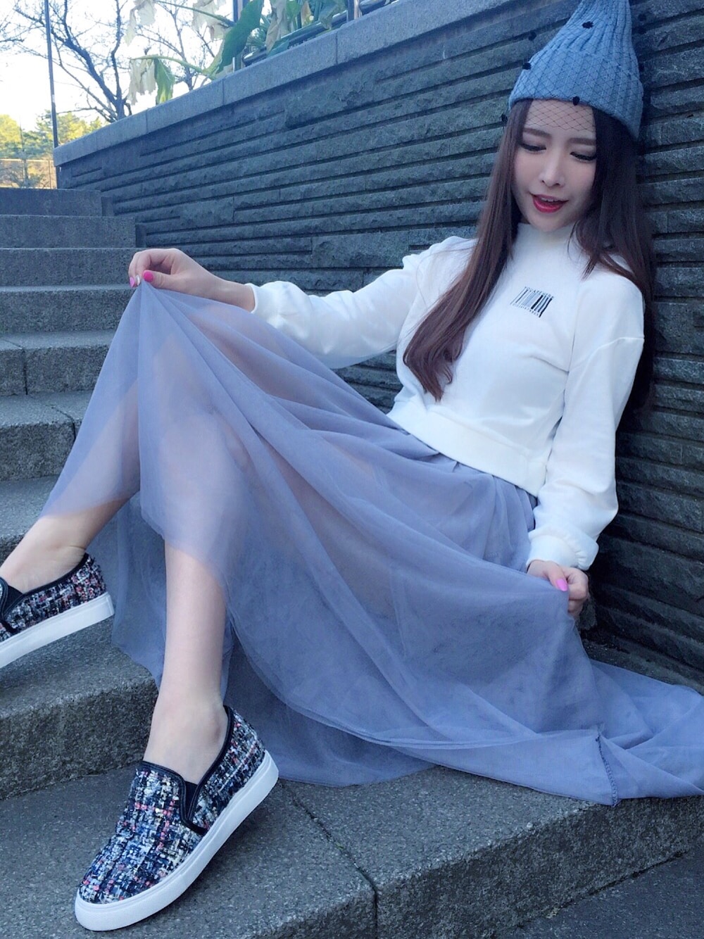 グレー系のスカート、ホワイト系のスウェット、グレー系の帽子を着用したレディースの春コーディネートの1枚目の写真