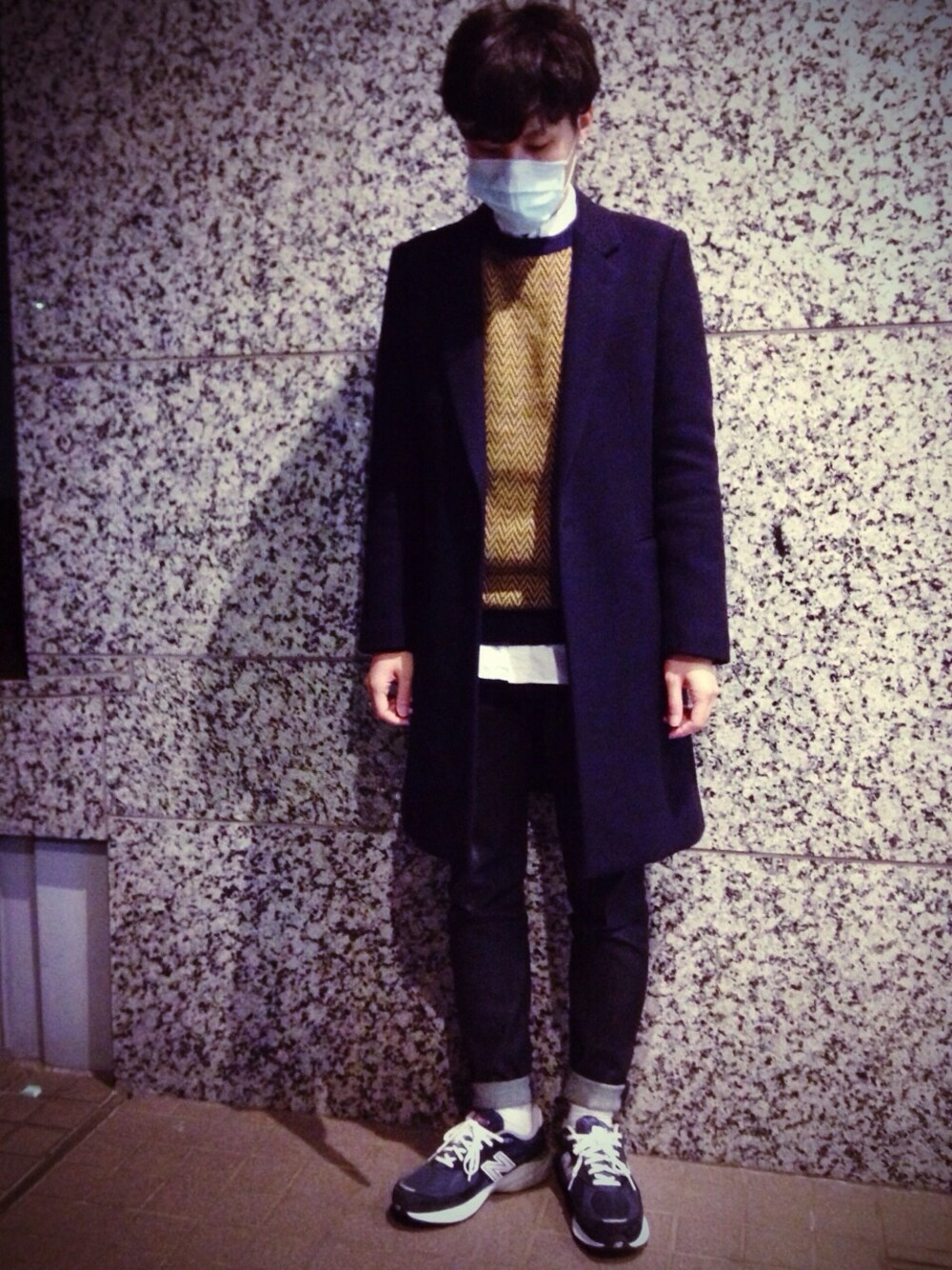 この年で声変わりしました チェスターコート:JOHN LAWRENCE SULLIVAN ニット:JOHN LAWRENCE SULLIVAN シャツ:soe shirts デニムパンツ:JOHN LAWRENCE SULLIVAN スニーカー:new balance