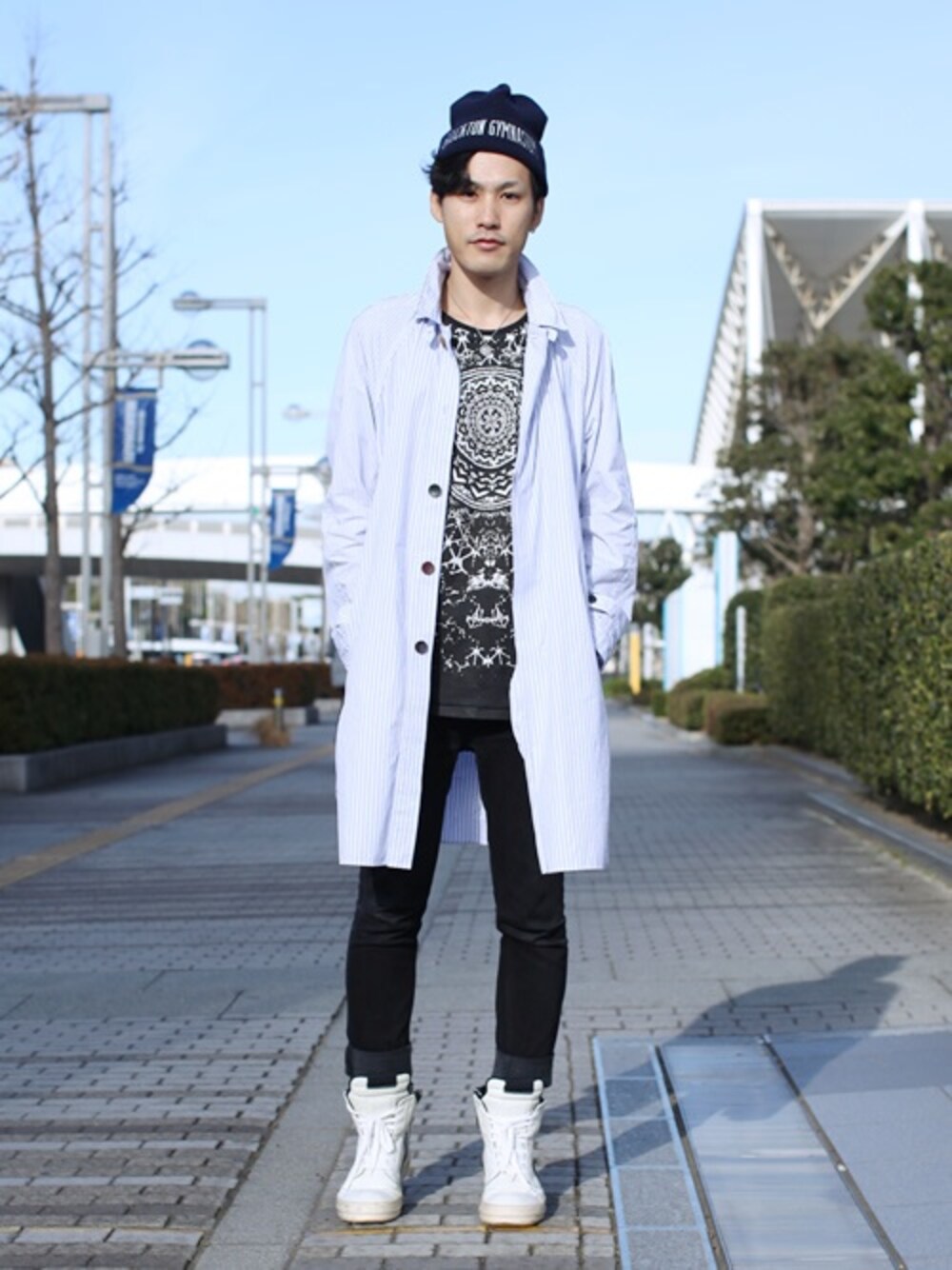 風が冷たい日でした Tシャツは丈長めな所が気に入ってます photo by chie ニットキャップ:BROCKTON GYMNASIUM ロングシャツ:UNDERCOVERISM Tシャツ:KSUBI スニーカー:RICK OWENS