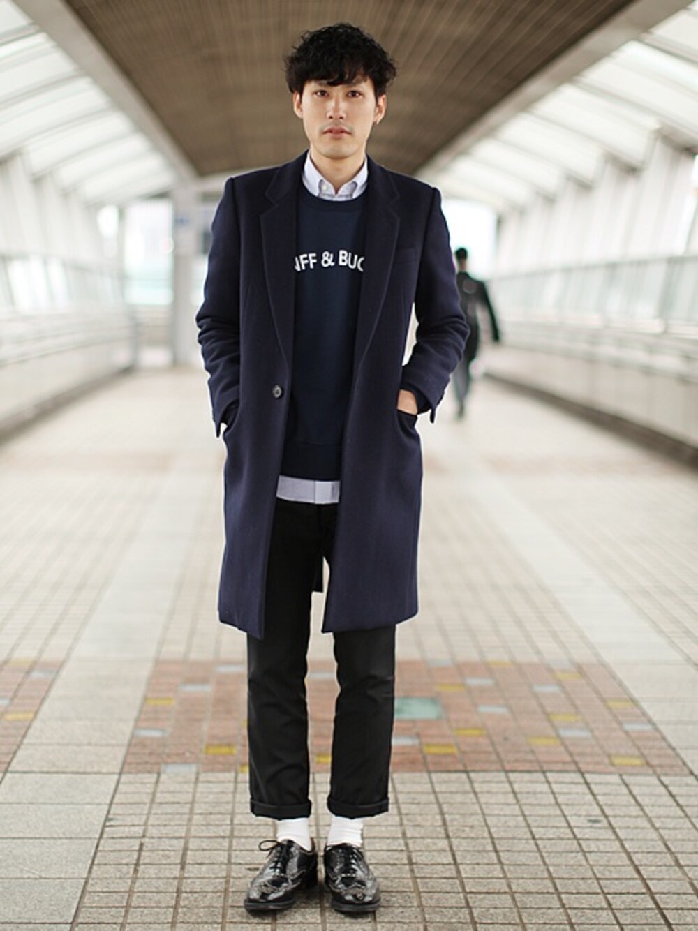 ネイビー×ネイビー コート:JOHN LAWRENCE SULLIVAN スウェット:.efilevol スラックス:LOUNGE LIZARD シューズ:church's
