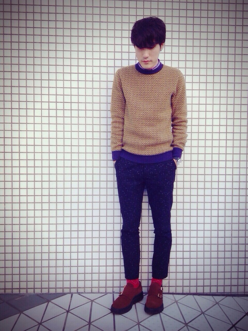 ヘリンボーン×絣チェック ニット:JOHN LAWRENCE SULLIVAN スラックス:LAD MUSICIAN シューズ:KIDS LOVE GAITE
