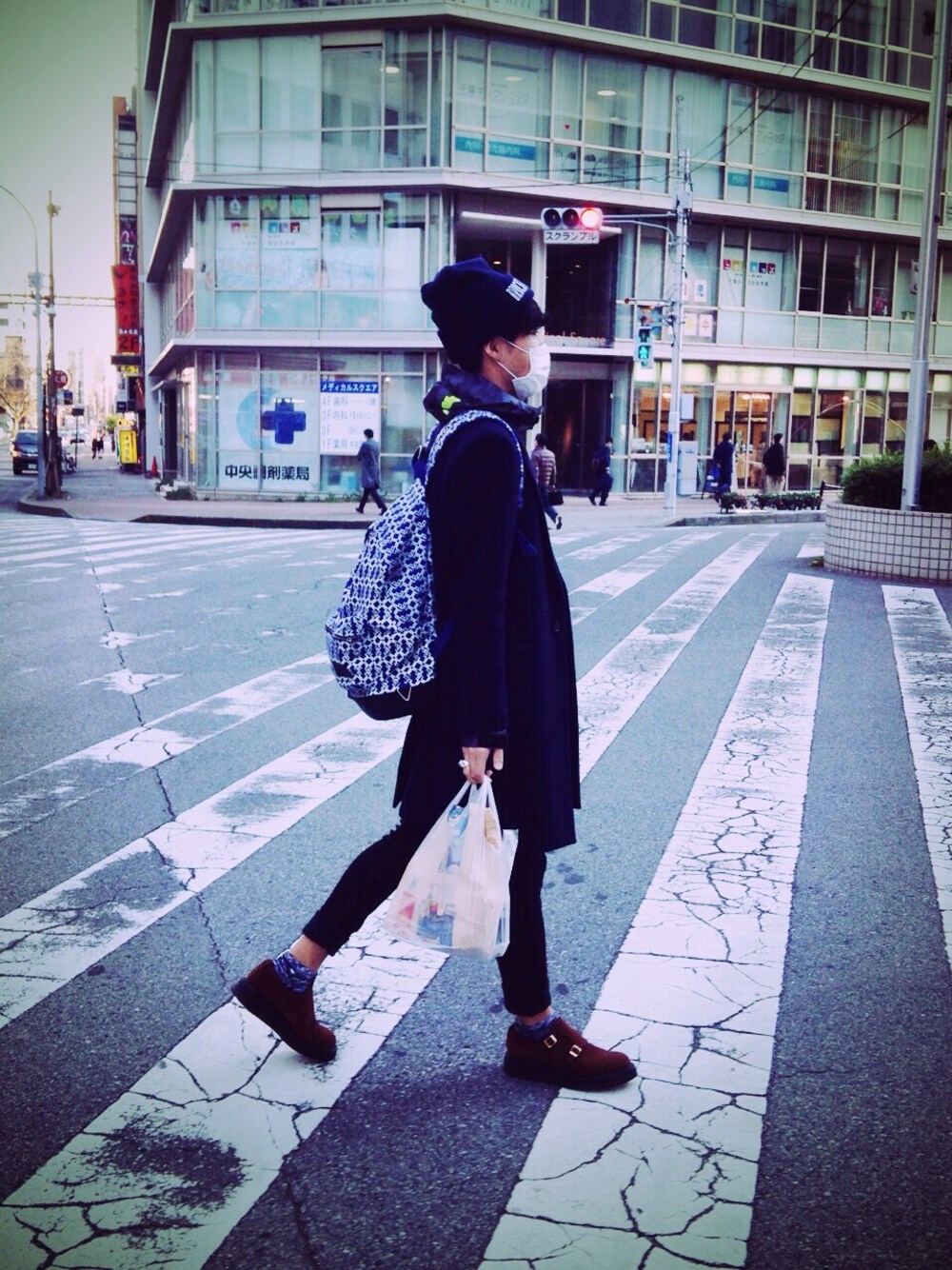 最近こんな格好ばかり… コート:JOHN LAWRENCE SULLIVAN ニットキャップ:BROCKTON GYWNASIUM シューズ:KIDS LOVE GAITE バックパック:KRIS VAN ASSHE×EAST PAK