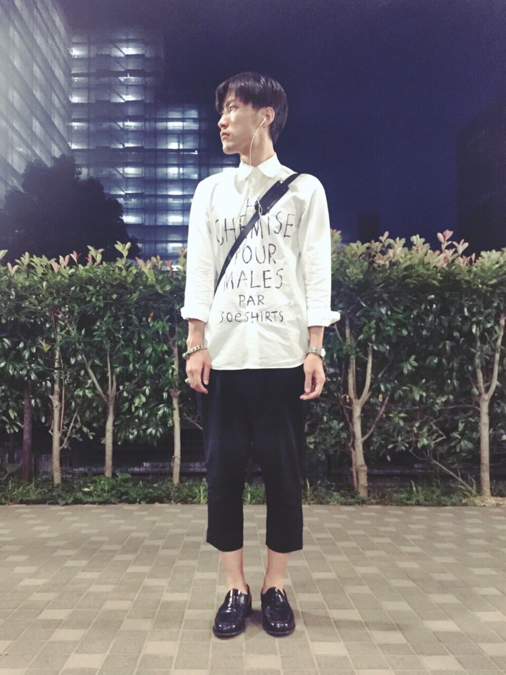 背景が暗くてサルエル感が伝わりません笑 ちょっと遊びの効いた白シャツ×スラックスの組み合わせが一番落ち着きます。