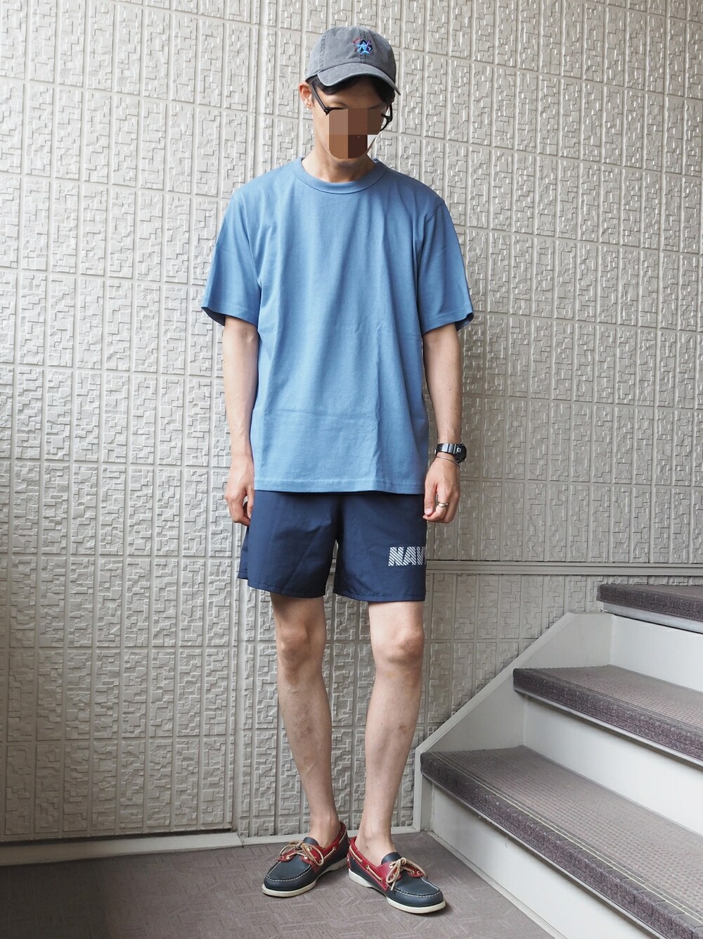 GUのコットンTシャツに、NewbaranceのUSNAVYトレーニングショーツ。 足元はUSユーズドのSEBAGOのデッキシューズで。