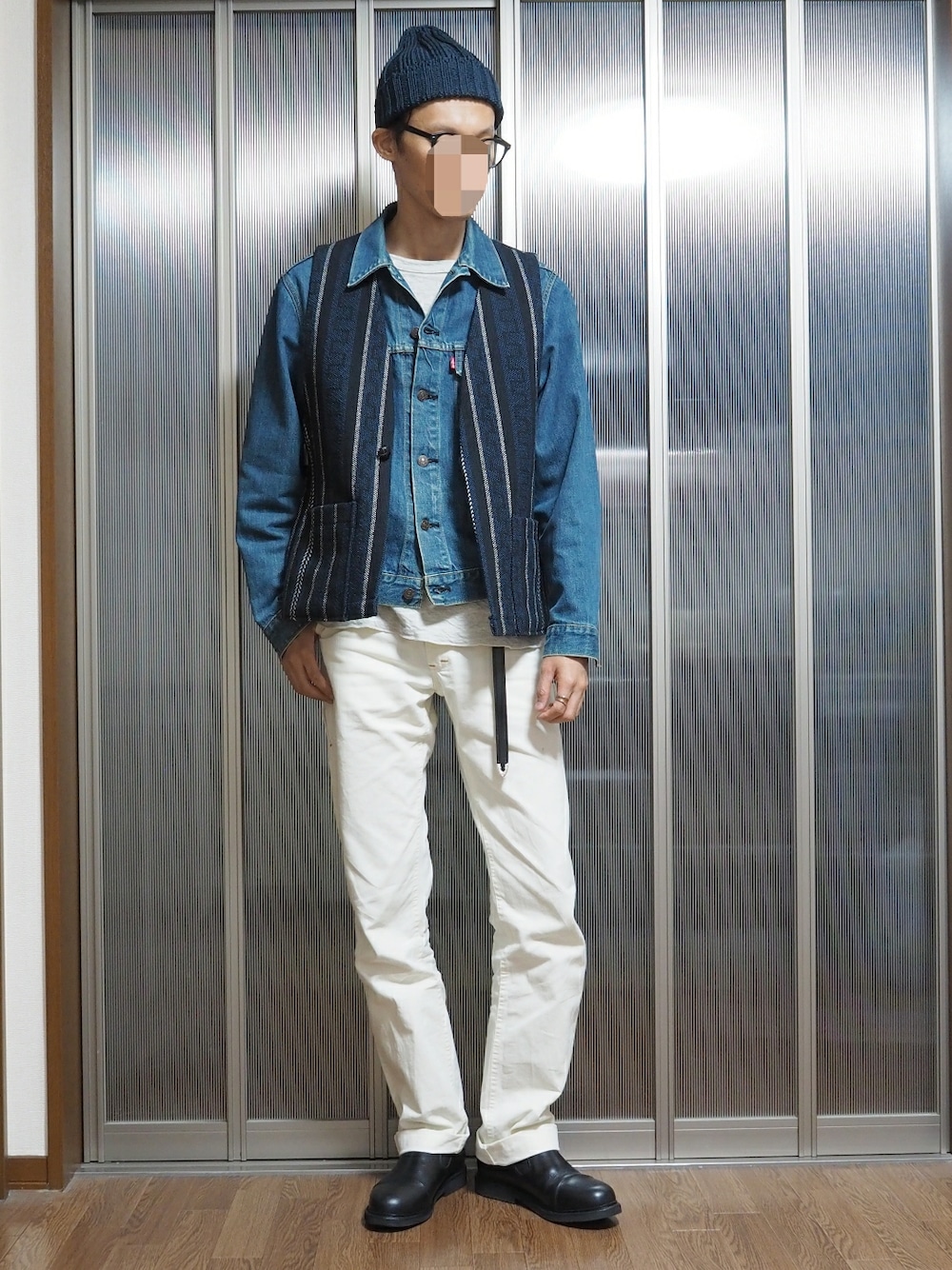 いつもご覧頂きありがとうございます。 今日はユーズドのLevi'sのデニムジャケットに、Nasngwamのベストをレイヤードしたスタイルです。 パンツはUSユーズドのカータースのペインターパンツに、足元はANDALSのレザーシューズ。 垂らしたベルトはモニタリーのロングベルトです。 このNasngwamのベストを買ったときに、やりたい!と思った組み合わせがこのデニムジャケットとのレイヤード。 また違うパンツとの組み合わせでもやってみようと思います。