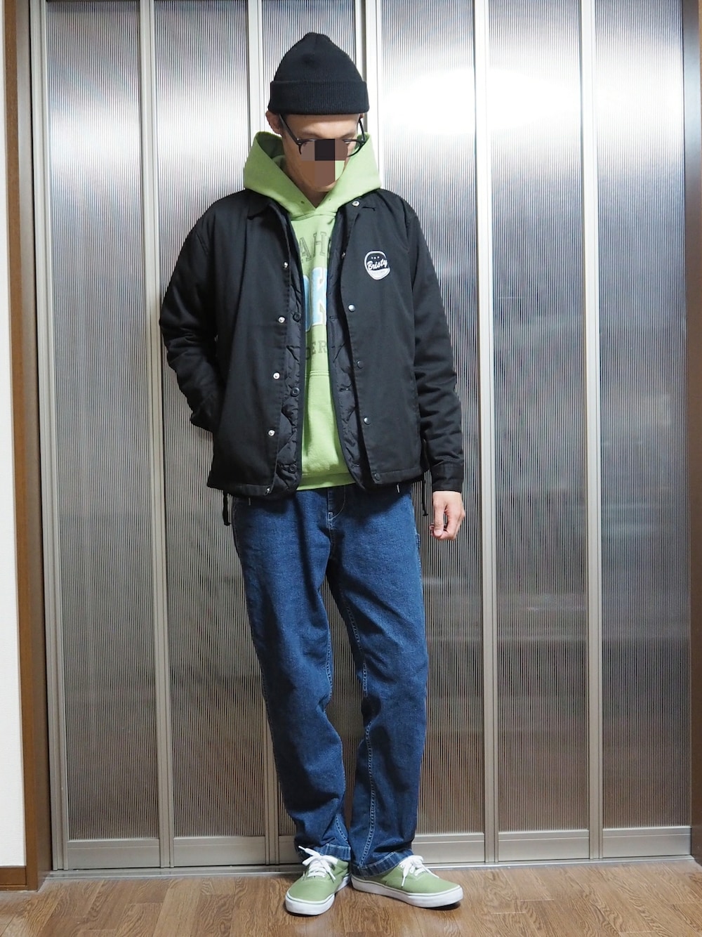 いつもありがとうございます。 今日はストリートテイストなコーディネートです。 セレクトショップBristyのオリジナルコーチジャケットに、TAIONのインナーダウンベスト、パーカーはUSユーズドのものです。 パンツはユニクロのデニムワークパンツに、足元はパーカーと色を合わせてVANSのオーセンティックです。