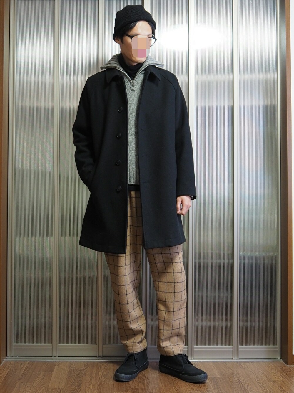 いつもありがとうございます。 今回はコートとニットでの冬スタイルです。 coenのコートに、インナーはUSユーズドのCarharttのハーフジップニットに、ユニクロのタートルネックカットソーです。 パンツはweac.のウールイージーパンツに、足元はムーンスターのスニーカーです。