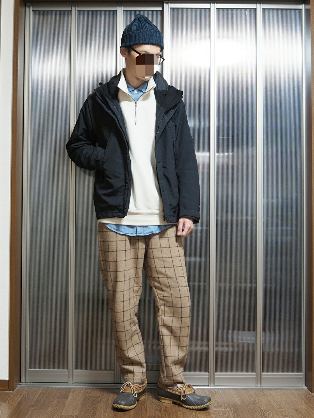 いつもありがとうございます。 今日は、00'sのCAMP7のマウンテンパーカーに、インナーはユニクロのハーフジップスウェットとUSユーズドのシャンブレーシャツをレイヤード。 パンツはweac.のウールイージーパンツに、足元はL.L.BEANのビーンブーツです。