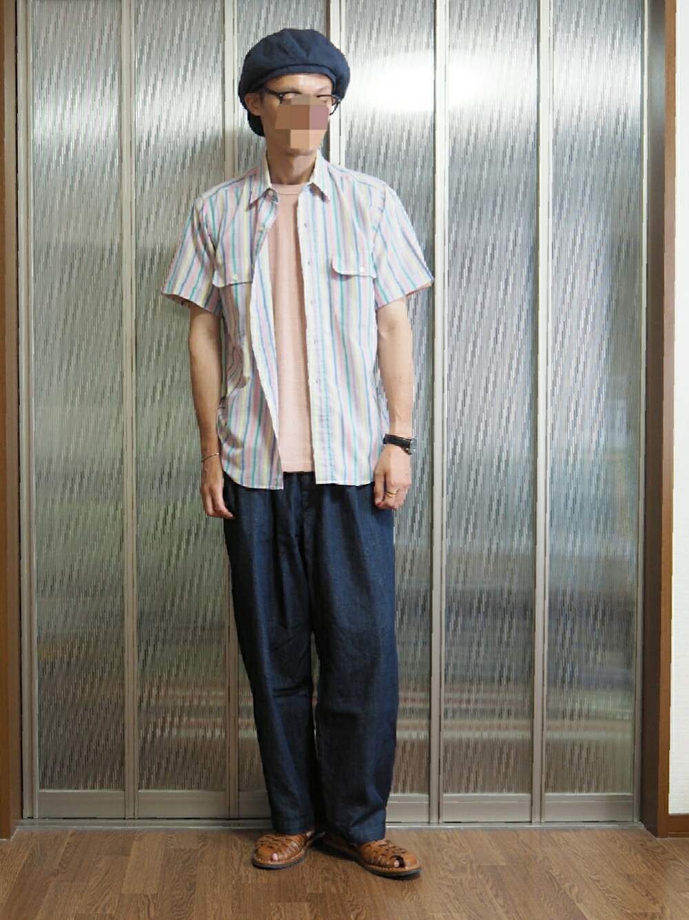 ご覧頂きありがとうございます。 今日はUSユーズドのマルチカラーストライプシャツに、インナーはグローバルワークのフライスTシャツ。 パンツはSpellboundのワイドデニムイージーパンツ、足元はARTESANOSのレザーサンダルです。 帽子はHIGHERのキャスケットを後ろ被りしています。