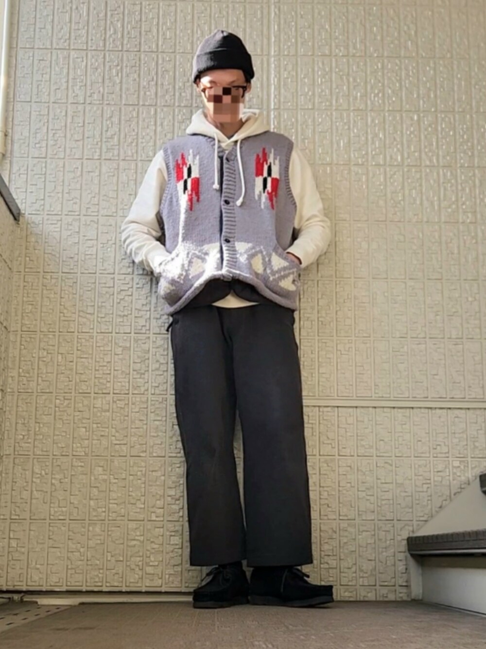 ニットベストとパーカーをレイヤード。 それだけだと少し寒いので、間にTAIONのインナーダウンベストを着ています。 パンツはBRENA のコットンメルトンパンツ。 足元はClarksのGORE-TEXワラビーです。
