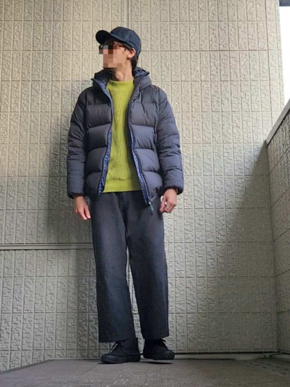 SLOWHANDS のダウンジャケットに、JACKMAN の鮮やかな黄緑色のワッフルモックネックをインナー合わせました。 デニム生地のキャップはHIGHER です。