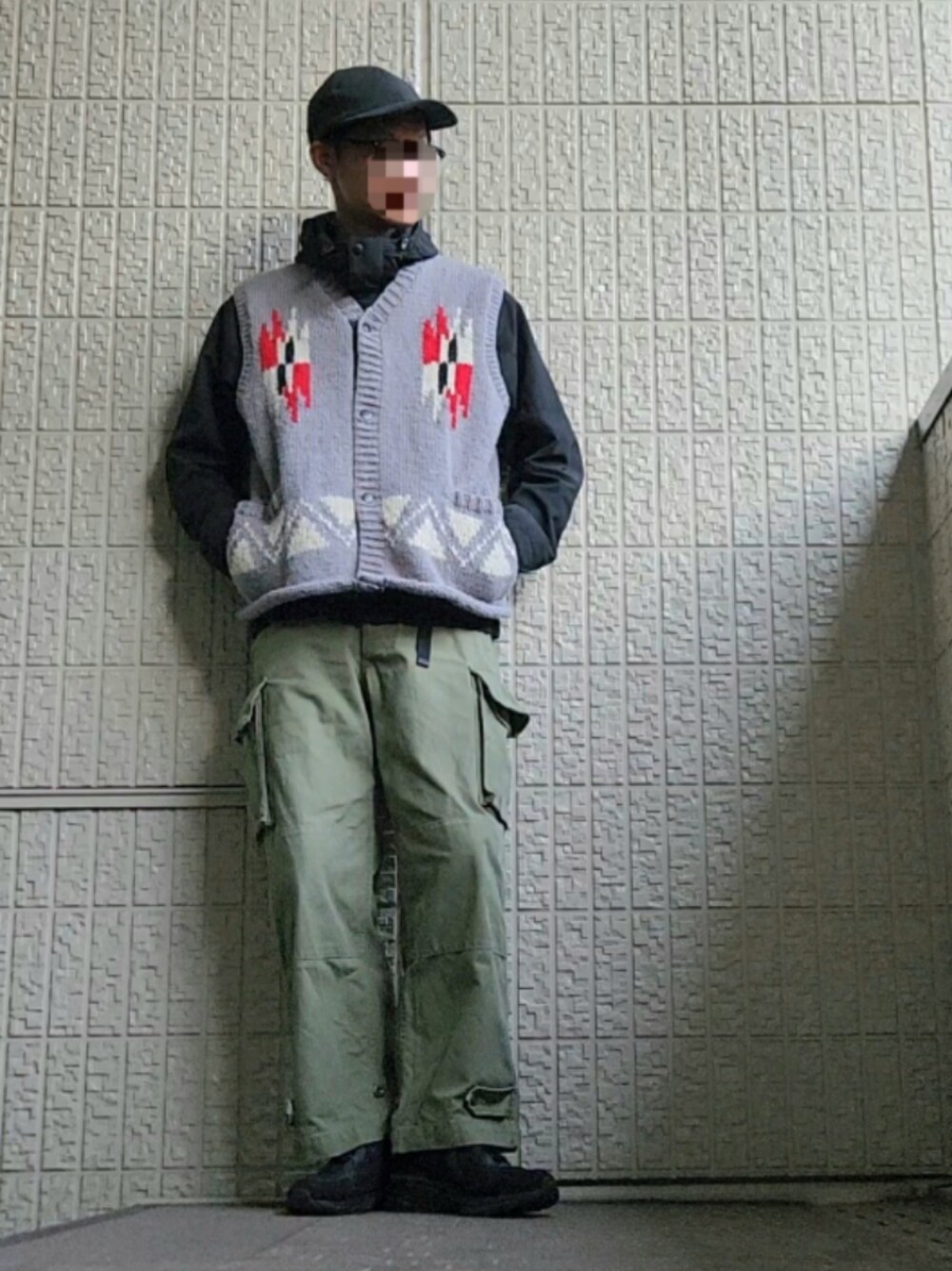 トップスはナイロンとウールニットの異素材同士のレイヤードに、パンツはM47カーゴパンツ。 足元は少しボリュームのあるスニーカーで。