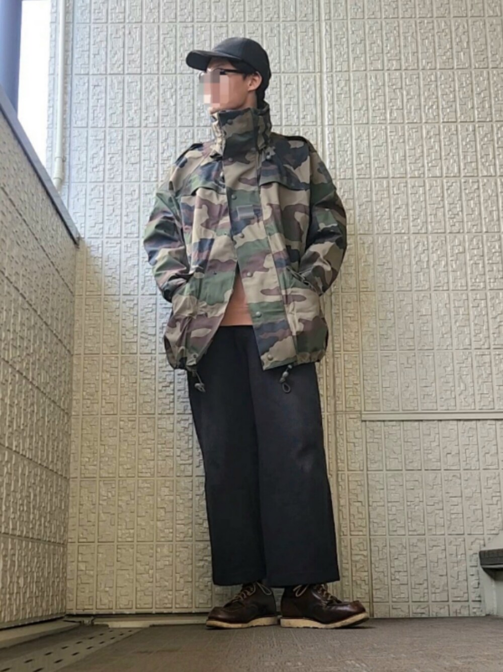 フランス軍のウォータープルーフジャケットをメインに、パンツはBRENAのコットンメルトンパンツ、足元はレッドウイングを合わせてみました。