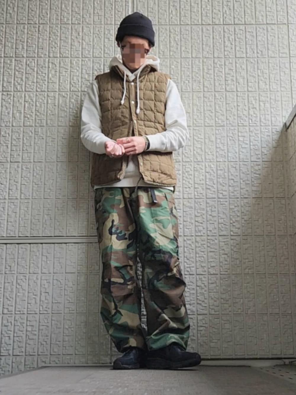 TAIONのリバーシブルダウンベストにJACKMANのパーカー。迷彩パンツはアメリカ軍のM-65。 スニーカーはムーンスター810sです。