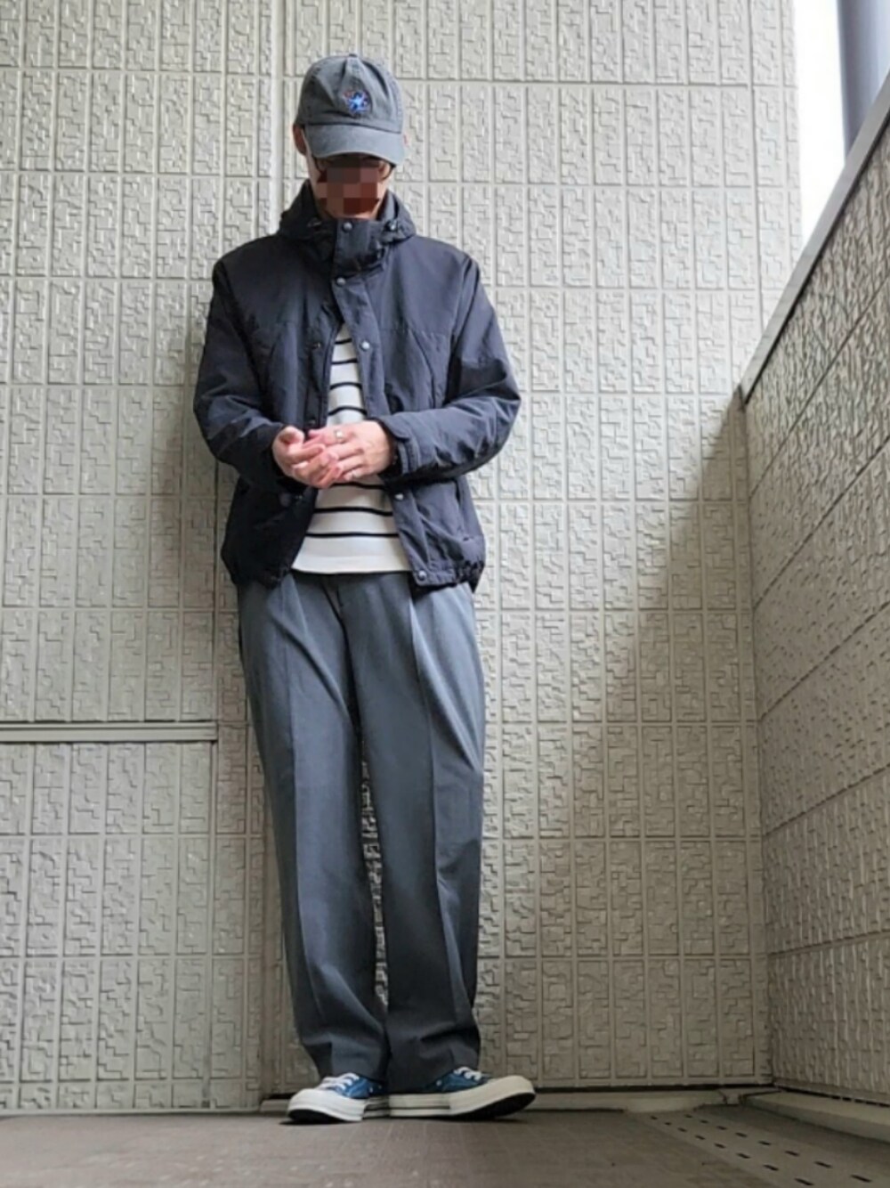 00'sのCAMP7のマウンテンパーカーに、インナーはEUusedのコットンニット。パンツはUNIQLOに、足元はCONVERSEのCT70です。