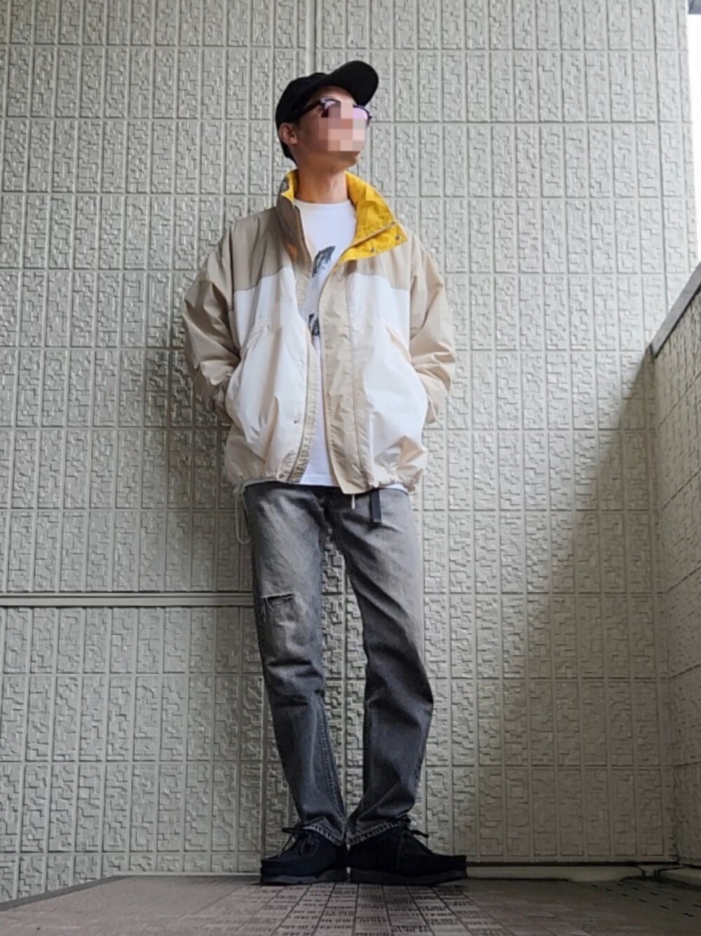 GUのナイロンアウターに、インナーはEELの猫プリントTシャツ。パンツは90's Levi's505。足元はClarksワラビーのGORE-TEXです。