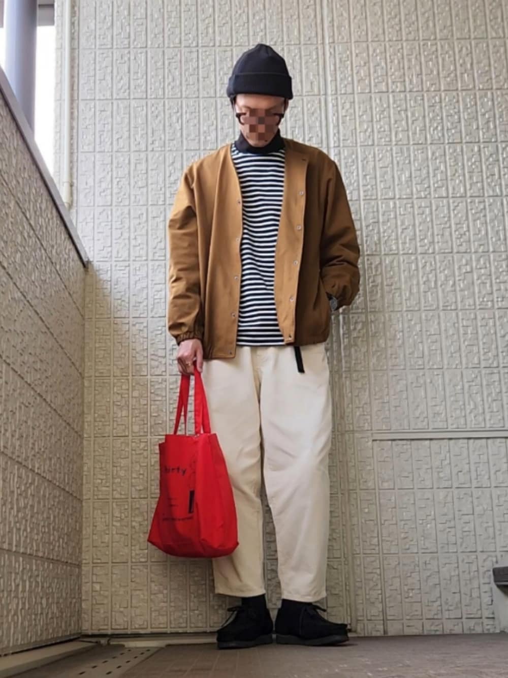 赤いトートバックは受注会のノベルティで貰ったOMNIGOD、カーディガンはBETTER、ボーダーモックネックはEEL、パンツはJOURNAL STANDARD、シューズはClarksです。
