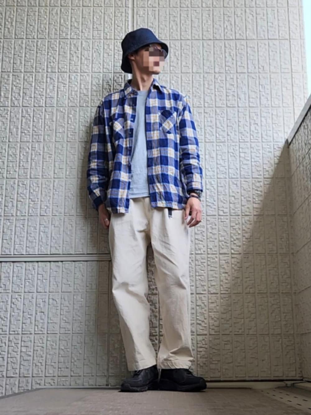 シャツはUS usedのプリントネルシャツ、パンツは無印良品、ハットはUNIQLOのデニムバケットハット、スニーカーは810sです。