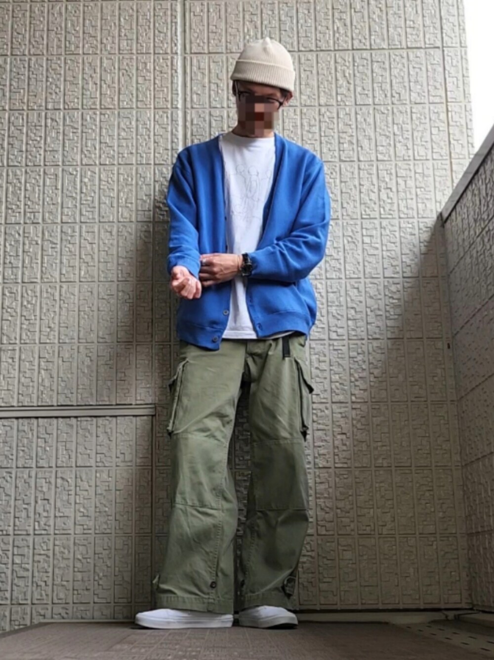 まだ肌寒い日があるので軽い羽織ものは欠かせませんね。カーディガンとキャップはGUカーゴパンツはLUCEBER 、スニーカーはVANSです。