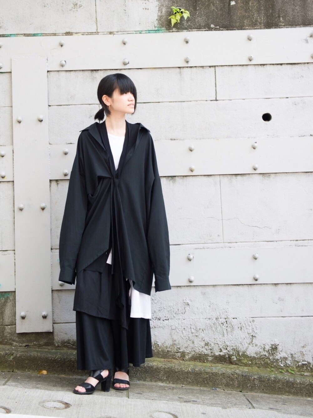 オーバーなアシンメトリーのシャツにリミフゥのインナーベストについてるネクタイをたらしてまとまりを出して見ました(*'▽'*)アシンメトリーのロングシャツってなかなかない!