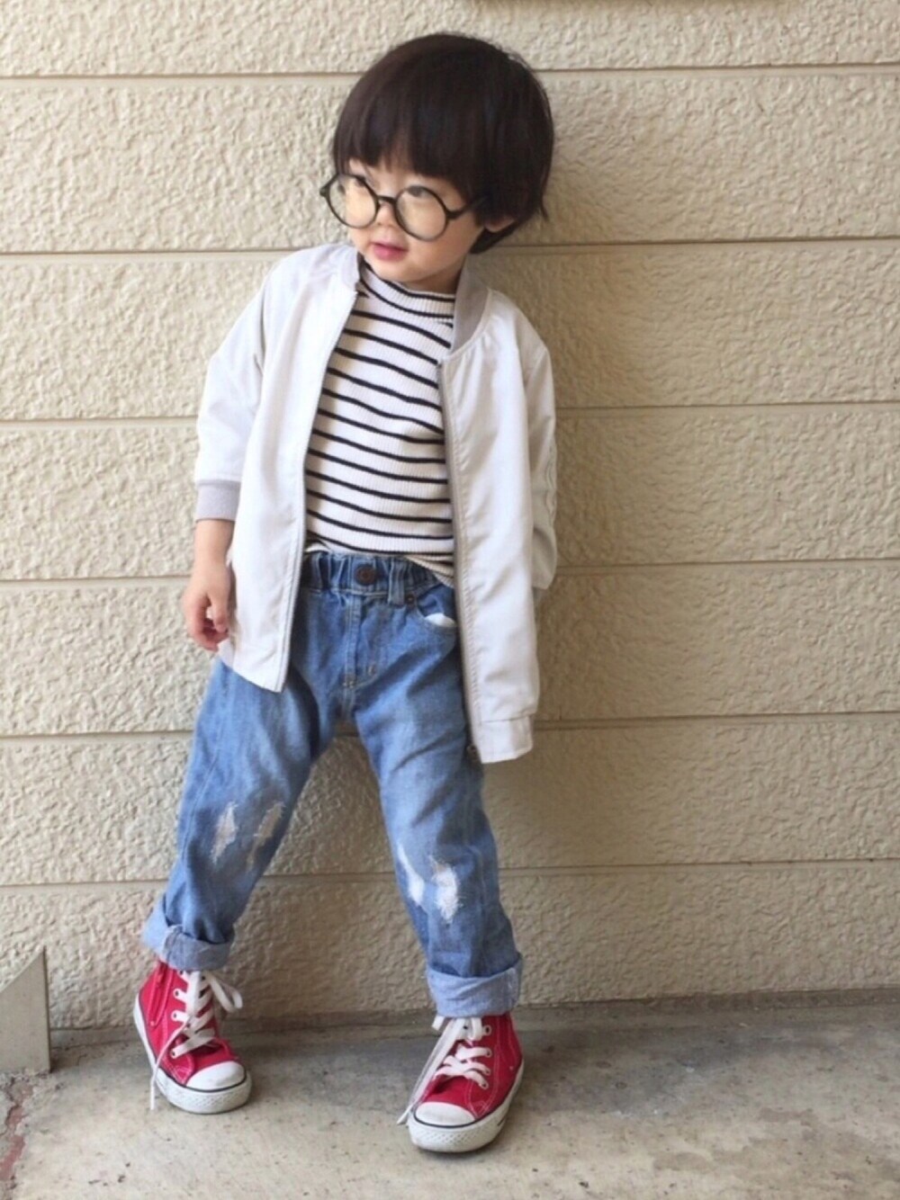 七分袖MA-1ジャケット☺︎♪ カーキと迷って、明るめグレーに挑戦! いっきに春らしくなって新鮮な感じ💓 サラリとした薄手素材で初夏までいけそう😍 ワンサイズあげてゆるっと着ています(*´꒳`*) ご覧いただきありがとうございます♡♡ ÷÷÷÷÷÷÷÷÷÷÷÷÷÷ 👦👉92cm × 12kg アウター👕110着用 トップス👚100着用 ボトムス👖100着用 ÷÷÷÷÷÷÷÷÷÷÷÷÷÷ instagram@suubox