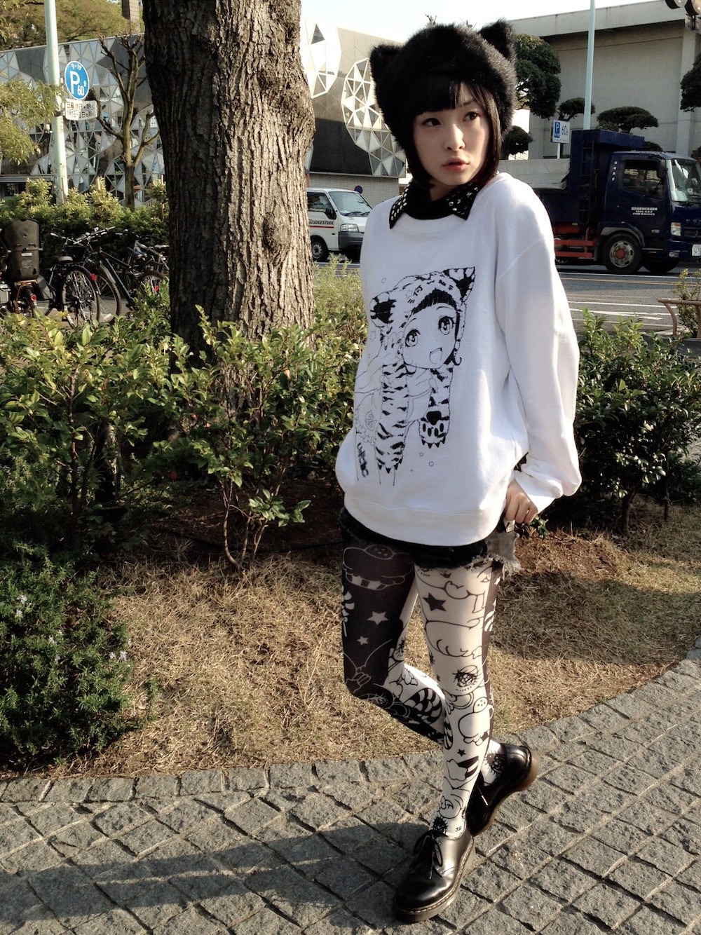 猫耳帽子 MILK 何処トレーナー 中に着ているシャツ、短パン jouetie タイツ せきやゆりえ 靴 Dr.Martens