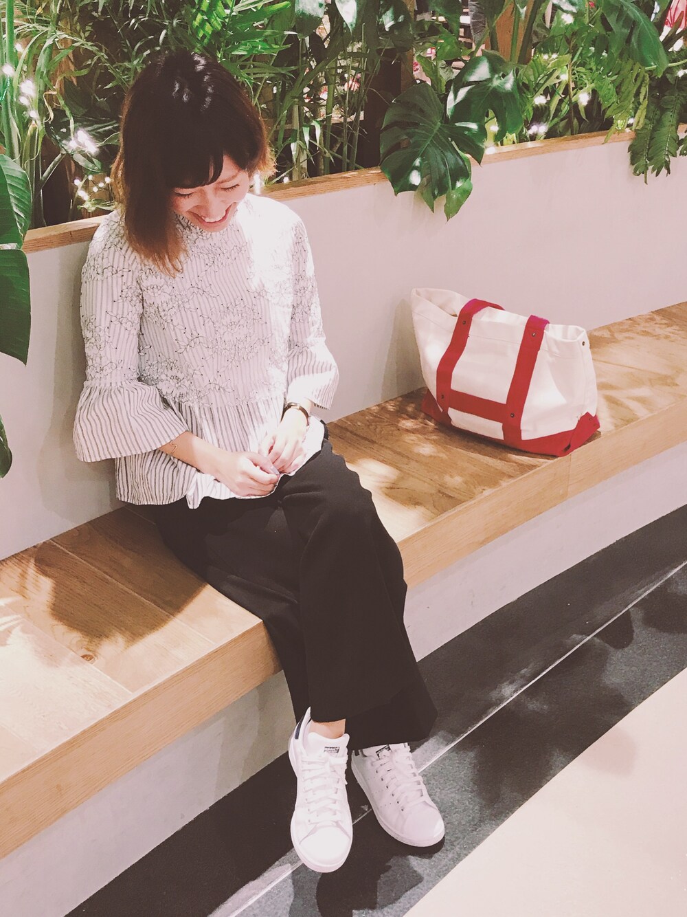 nico and...の店舗前の椅子で友だちと写真撮影会📸 . . . . ZARAのブラウスは秋口、春先使える万能ブラウス💫