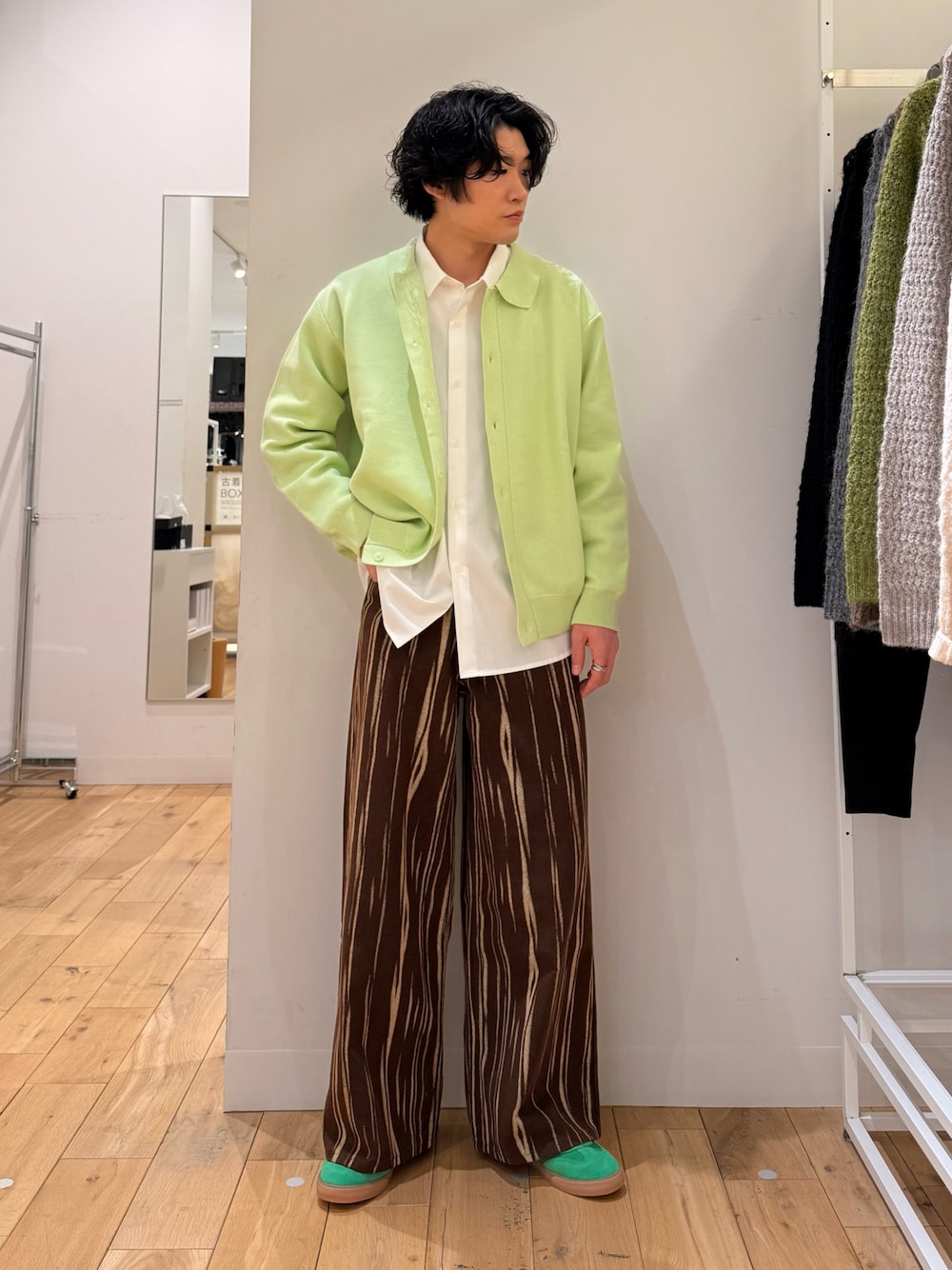 グリーンのカーディガンで春らしさを全開に🟩 暑くなってきたら、たすき掛けしても可愛いのでオススメです‼️ マーブル柄のパンツは奇抜さもありますが、シンプルなものに飽きた方には持ってこいなアイテムになっています。 スニーカーはカーディガンの緑を拾って、同じ色味にしてみました👍