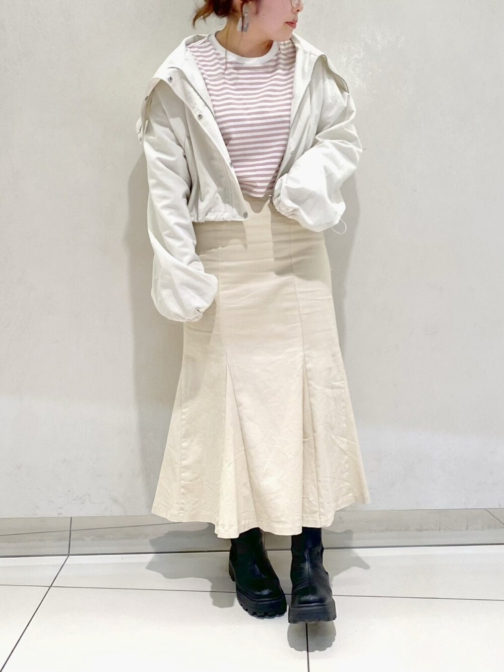 マーメイドスカートと相性バツグンの ショート丈マウンテンパーカー♡ 春らしくピンクを差し色にしました♪