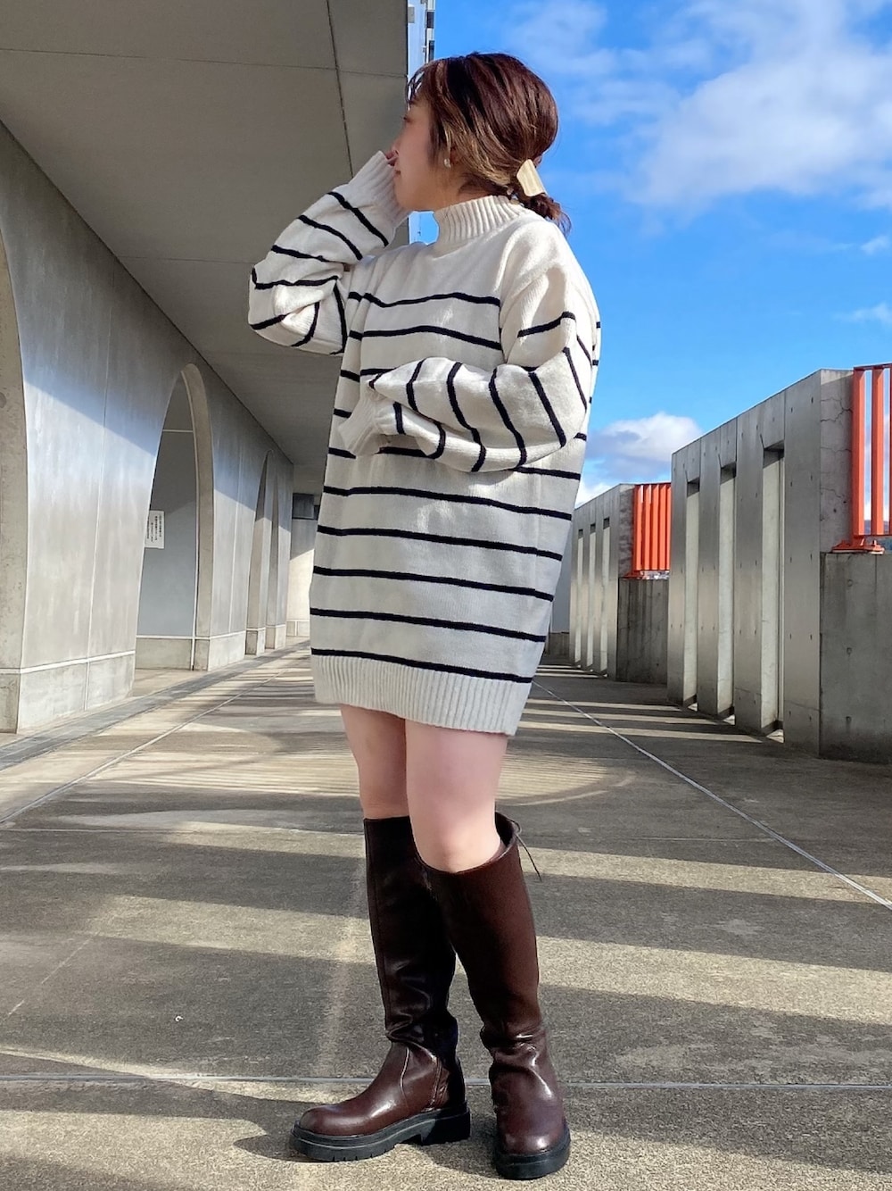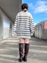 1枚で映えるボーダーニットチュニックを シンプルにロングブーツと合わせました◎