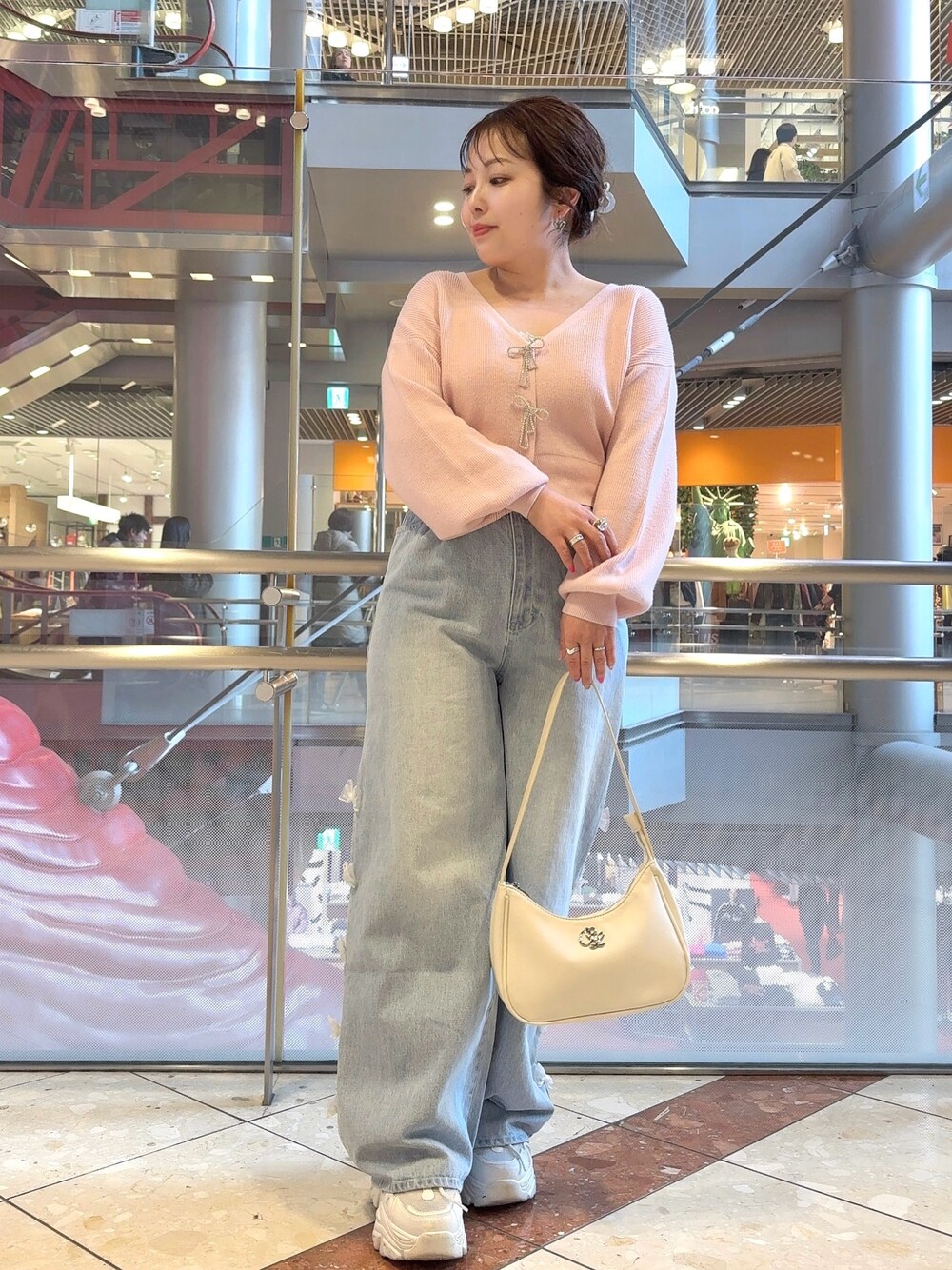 リボンのビジューブローチが目を惹くカーディガン♡ ピンク×デニム合わせがポイントです◎
