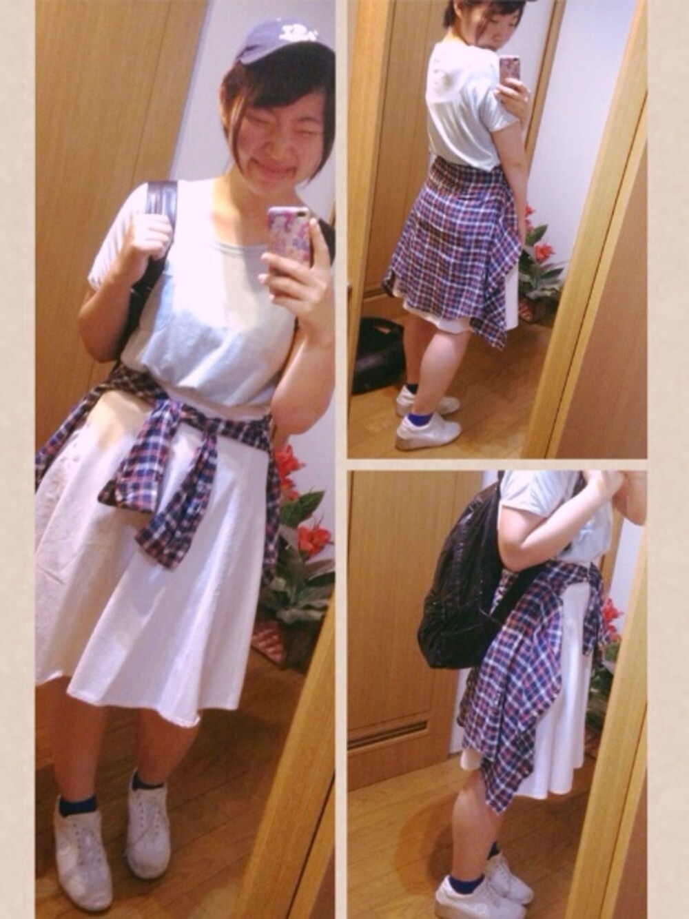 流行りの腰巻コーデ♥︎ チェックシャツを腰に巻いて、全体的に青で統一しました! スニーカー✖︎キャップ✖︎バックパックでスポーティなイメージに!