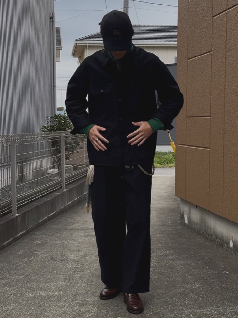 REVERBERATEの黒のモールスキンセットアップにグリーンカラーのチラリズム◼️🟢