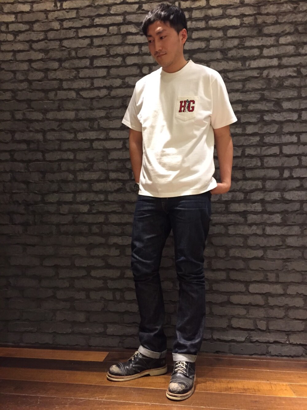 J(HYSTERIC GLAMOUR六本木ヒルズ店)のTシャツ/カットソー「HG COLLEGE pt ポケ付T-SH」を使ったコーディネート