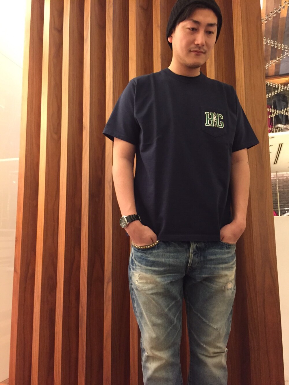 J(HYSTERIC GLAMOUR六本木ヒルズ店)のTシャツ/カットソー「HG COLLEGE pt ポケ付T-SH」を使ったコーディネート