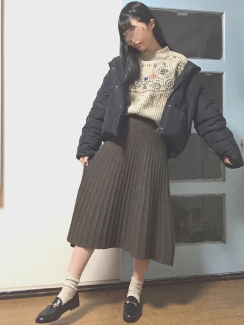 【ご覧いただきありがとうございます】 cornersのスカート、商品の写真のモデルさんが155センチほどだそうです。163.5センチが履くとこんな感じです。 履いている位置が違うのかもしれませんが、参考までに、、
