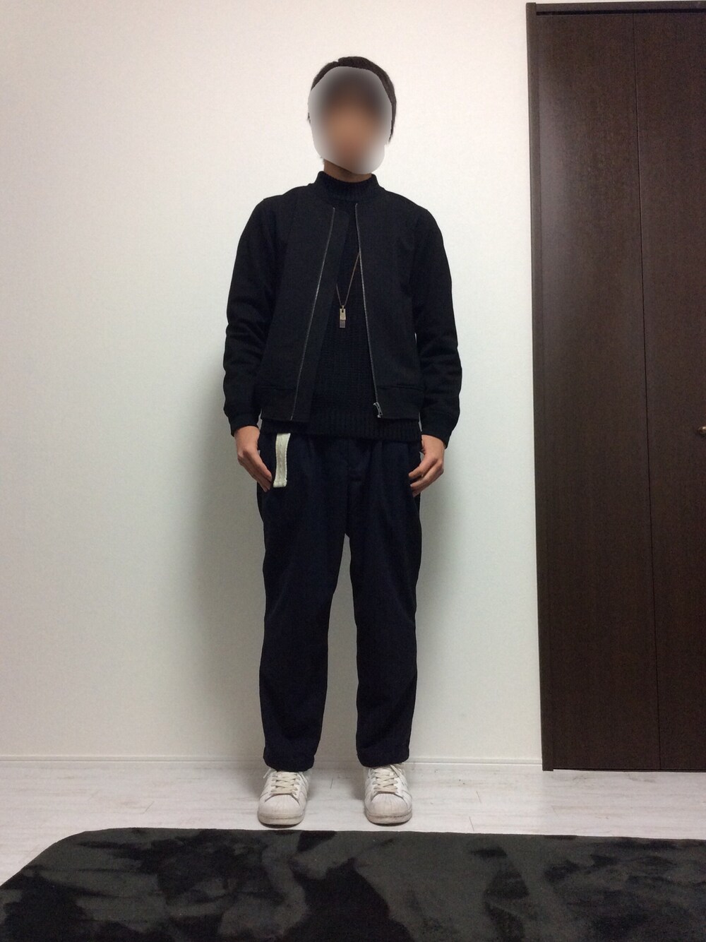 黒のモックネック風ニットにシンプルなMA-1下はワイドパンツで黒で統一してます ベルトとスニーカーで白を入れてます。黒が多過ぎるのかなー、と少し迷ってるのですがそこらへんもコメントしてもらえるとありがたいです 他にもこここうしたほうがいいやここいいねとかあったら言ってくれると嬉しいです😊