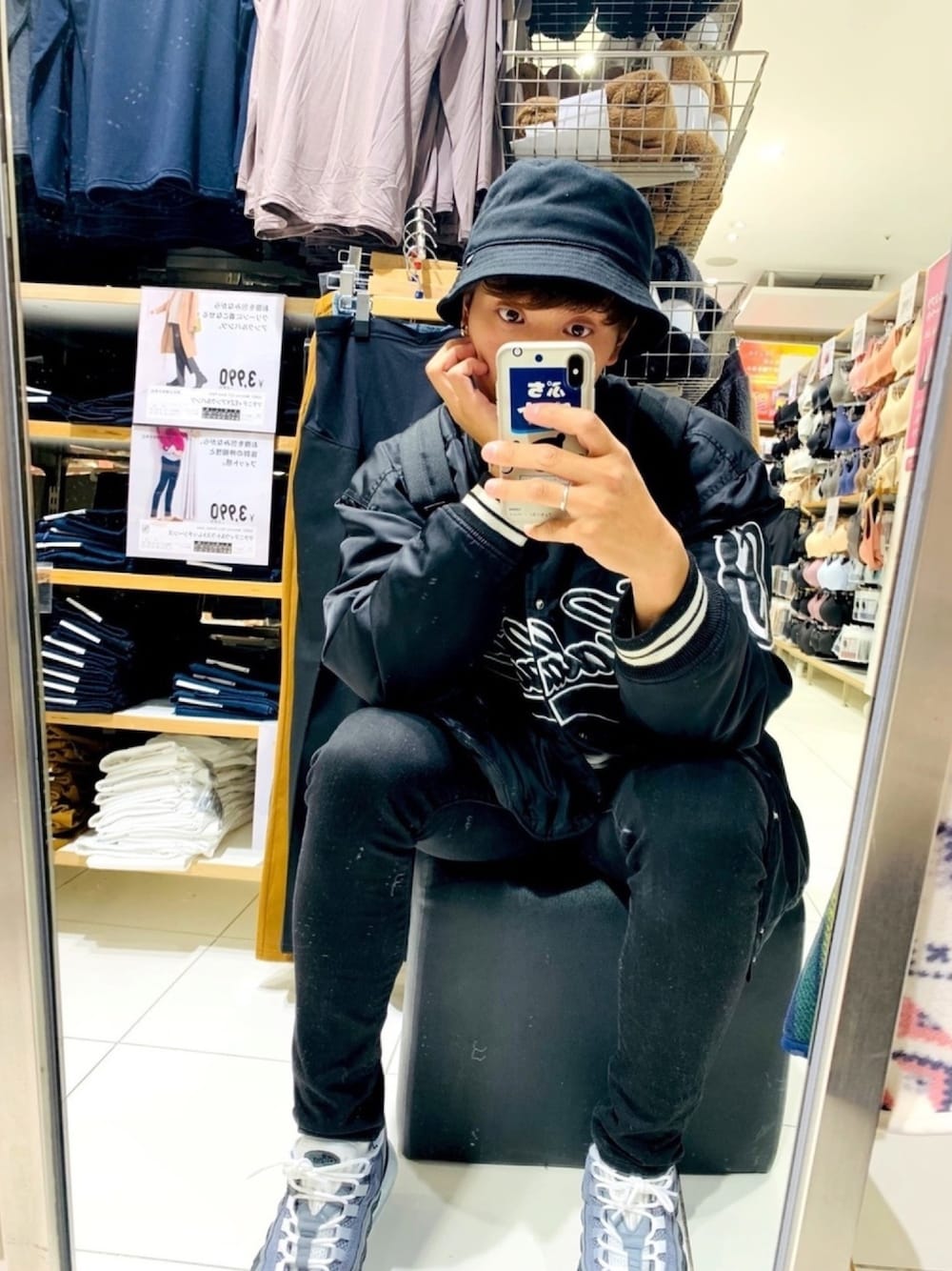 オールブラックコーデ 統一感が欲しくて トップスはGAPの白トレーナー アウターで上半身のシルエットをカバー バケットハットはまったよね