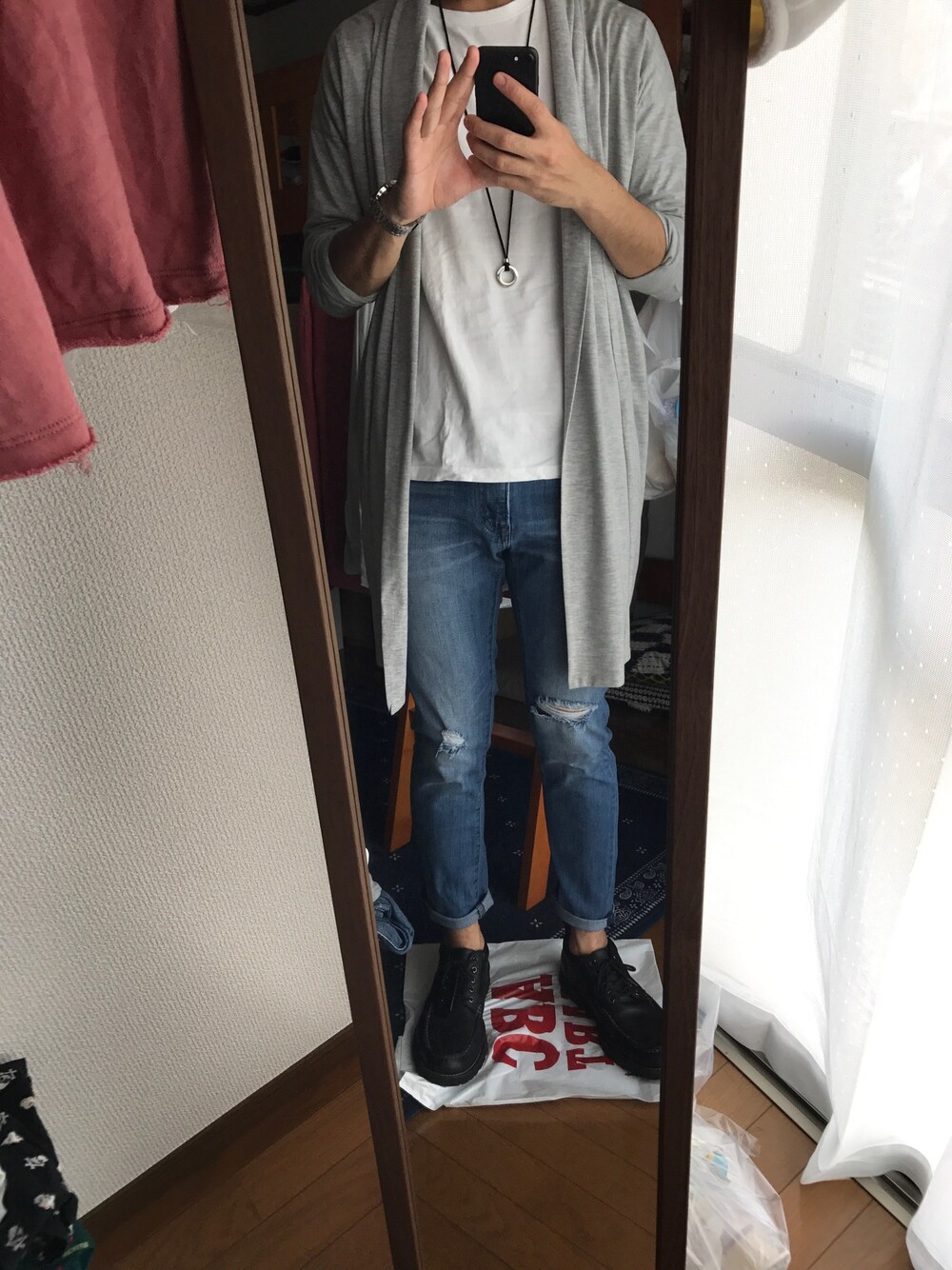 いつもいいねやお気にり登録、フォローして頂きありがとうございます😊 今日のコーデではグレーのロングカーディガン✖️白T✖️デニムのダメージにしてみました!今家の中にある洋服で色々と試行錯誤してどんなコーデができるか頑張っていきたいと思ってます! 今日は熱いけど涼しくて過ごしやすい日ですね。 今日は解禁シャツ(オープンカラーシャツ)を求めてショッピングモールへ行っています٩(๑❛ᴗ❛๑)۶