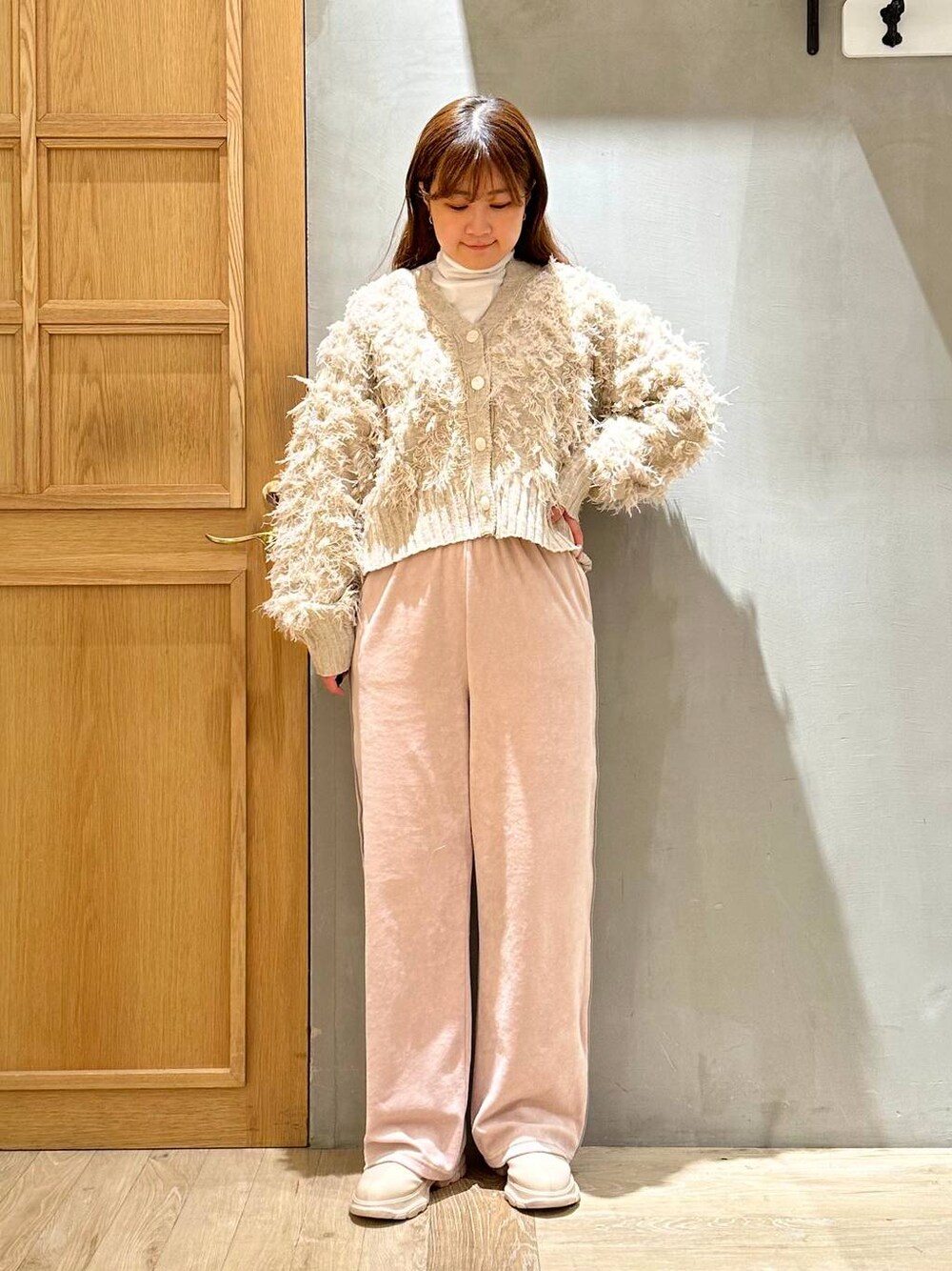 大人カジュアルに着こなせるラインベロアパンツです! イージーパンツなのでとっても着心地楽です! 丈は少し長めです! 165cmでくるぶしくらいです!