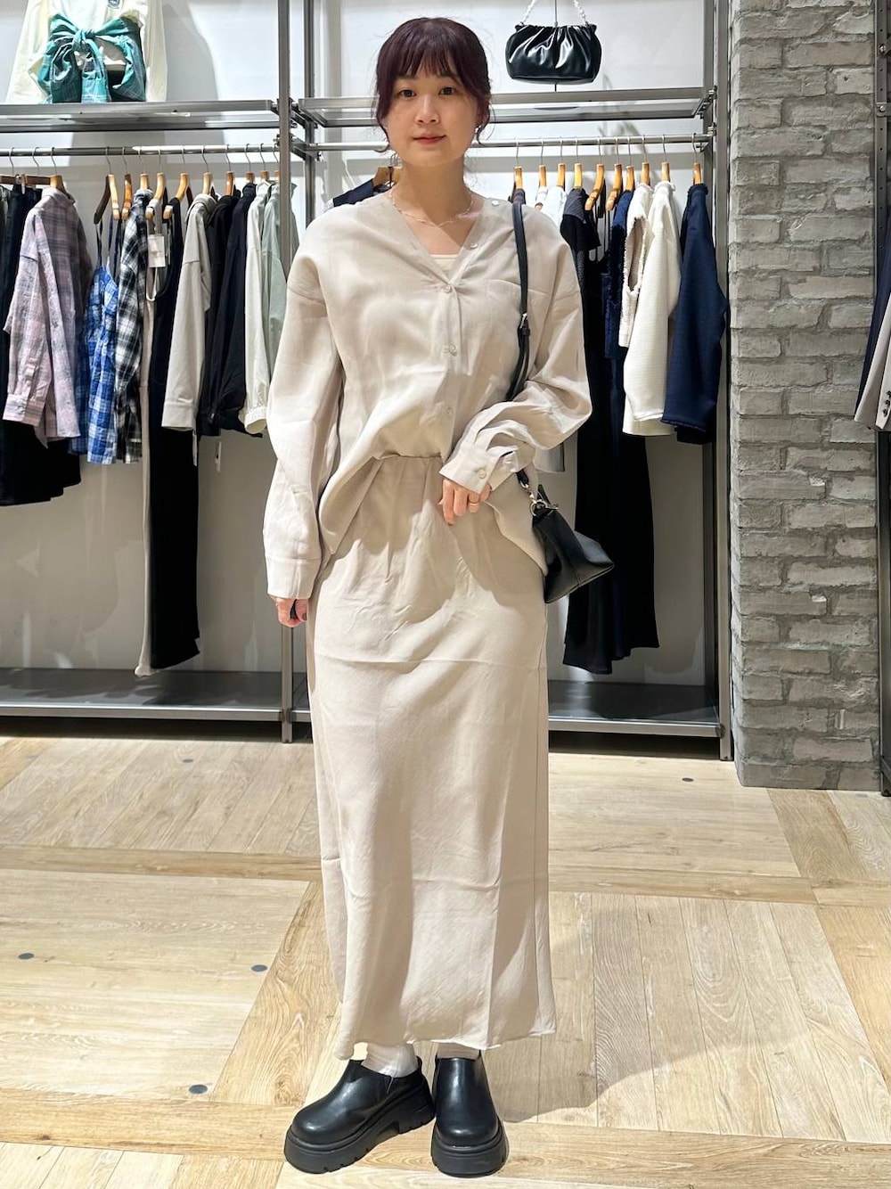 淡色カラー好きママのきれいめコーデ セットアップ可能なシャツとスカートで 女っぽコーデ テロっとした素材で着痩せ効果抜群です